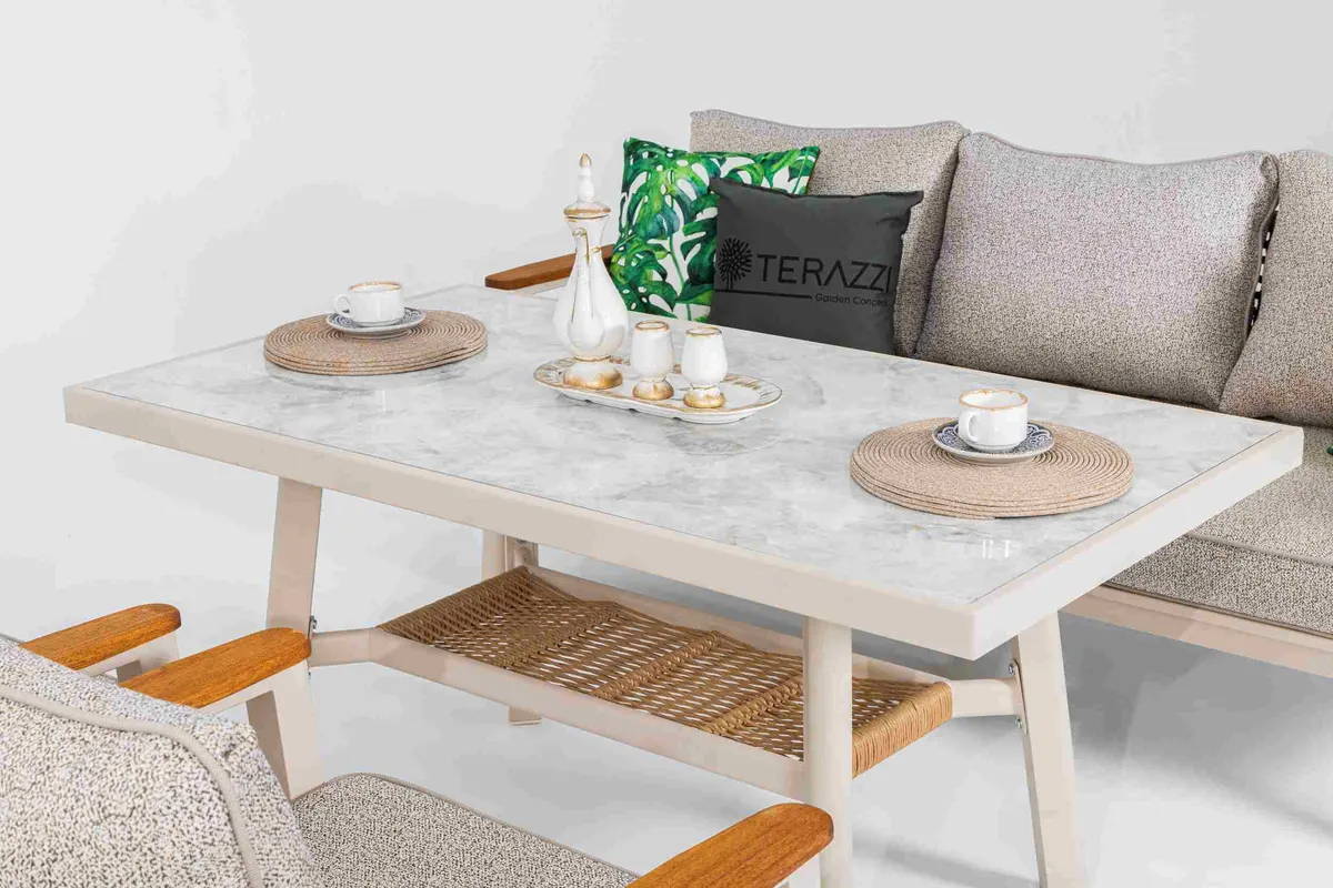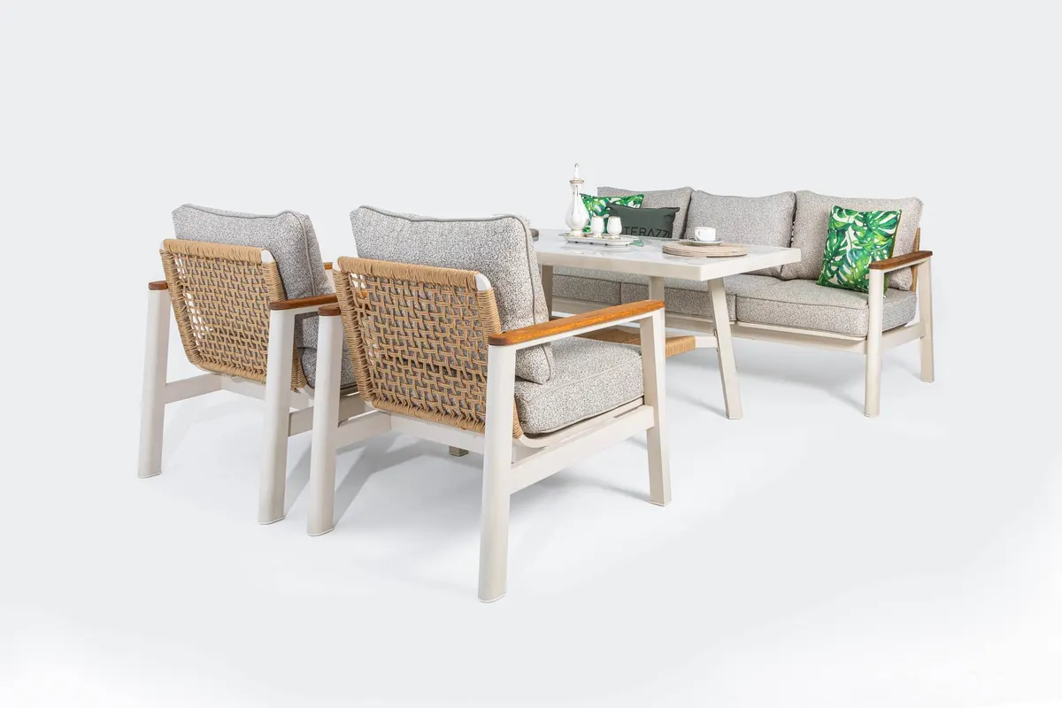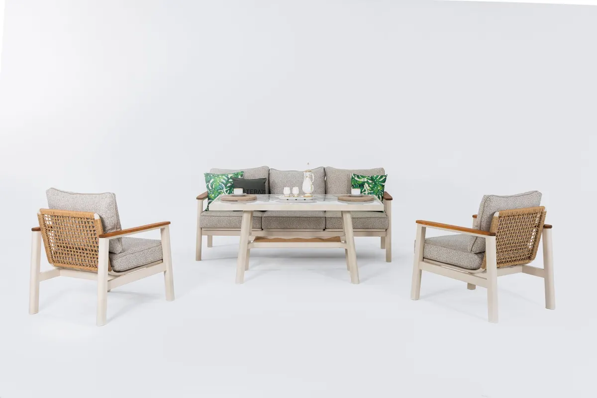 Astoria Bahçe Oturma Grubu, dış mekan dekorasyonunda şıklığı ve konforu sunar. Zamansız bu tasarımı Terazzi güvencesiyle alın, stilinizi dışarı yansıtın.