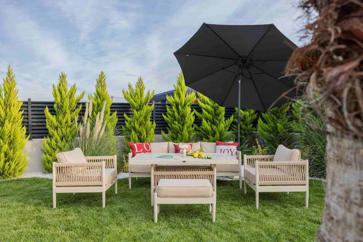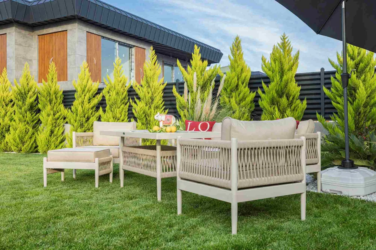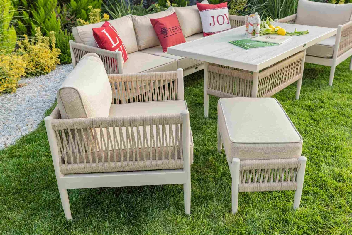 Zarafet ve modernliğin uyum içinde buluştuğu Lyon Oturma Grubu; alüminyum gövdesi ve ince işçilikle örülmüş ip detaylarıyla şık bir karakter ortaya koyuyor. Takımın tamamlayıcısı olan kullanışlı pufu ise, ister ek oturma alanı ister ayak uzatma ünitesi olarak, çok yönlü bir kullanım sunar.