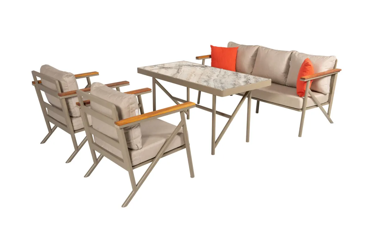 Uzun ömürlü alüminyum gövde, birinci sınıf İreko ağacı ve UV stabilizatörlü ip örgü ile hem şıklık hem dayanıklılık sunar.