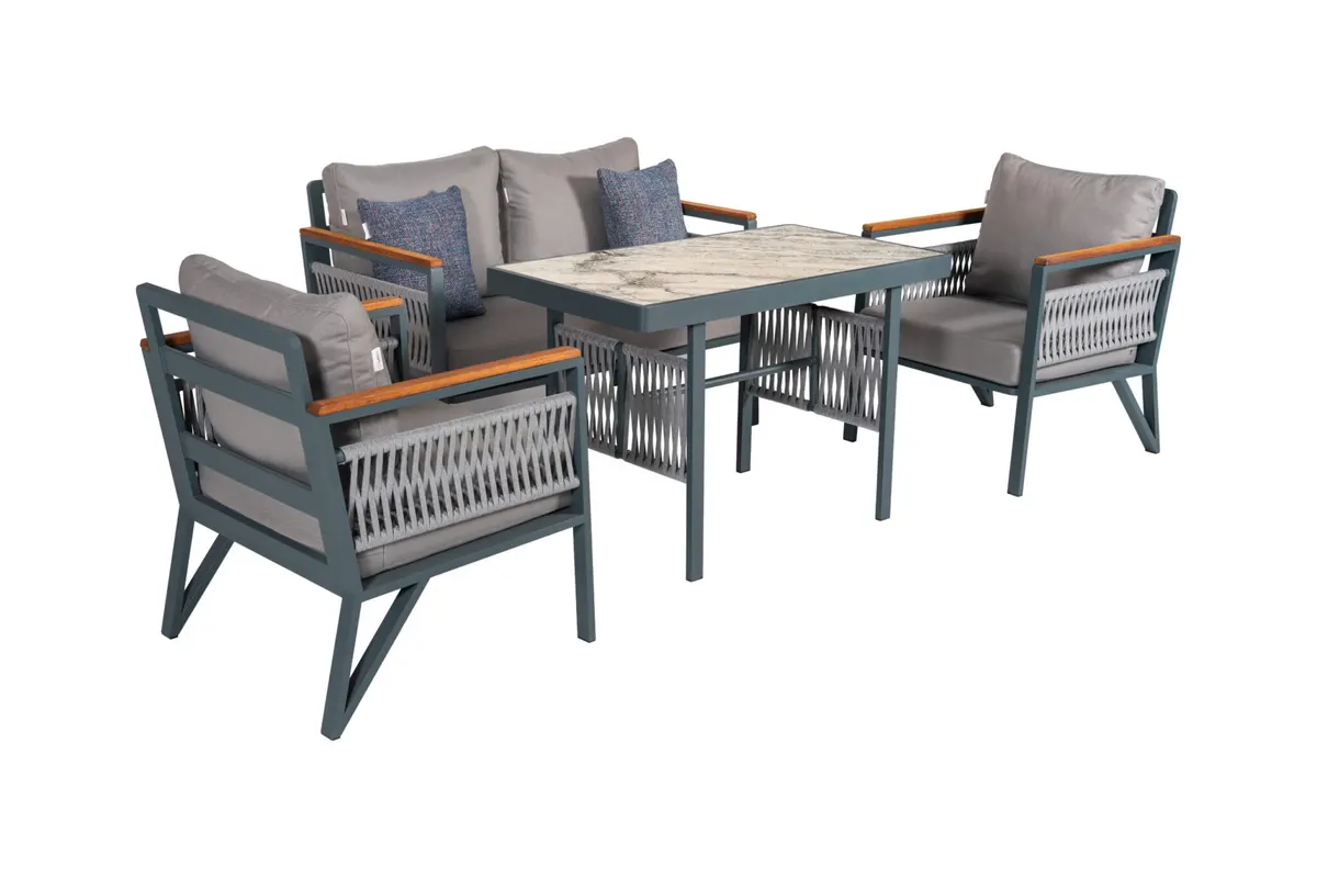 Uzun ömürlü alüminyum gövde, birinci sınıf İreko ağacı ve UV stabilizatörlü ip örgü ile hem şıklık hem dayanıklılık sunar.