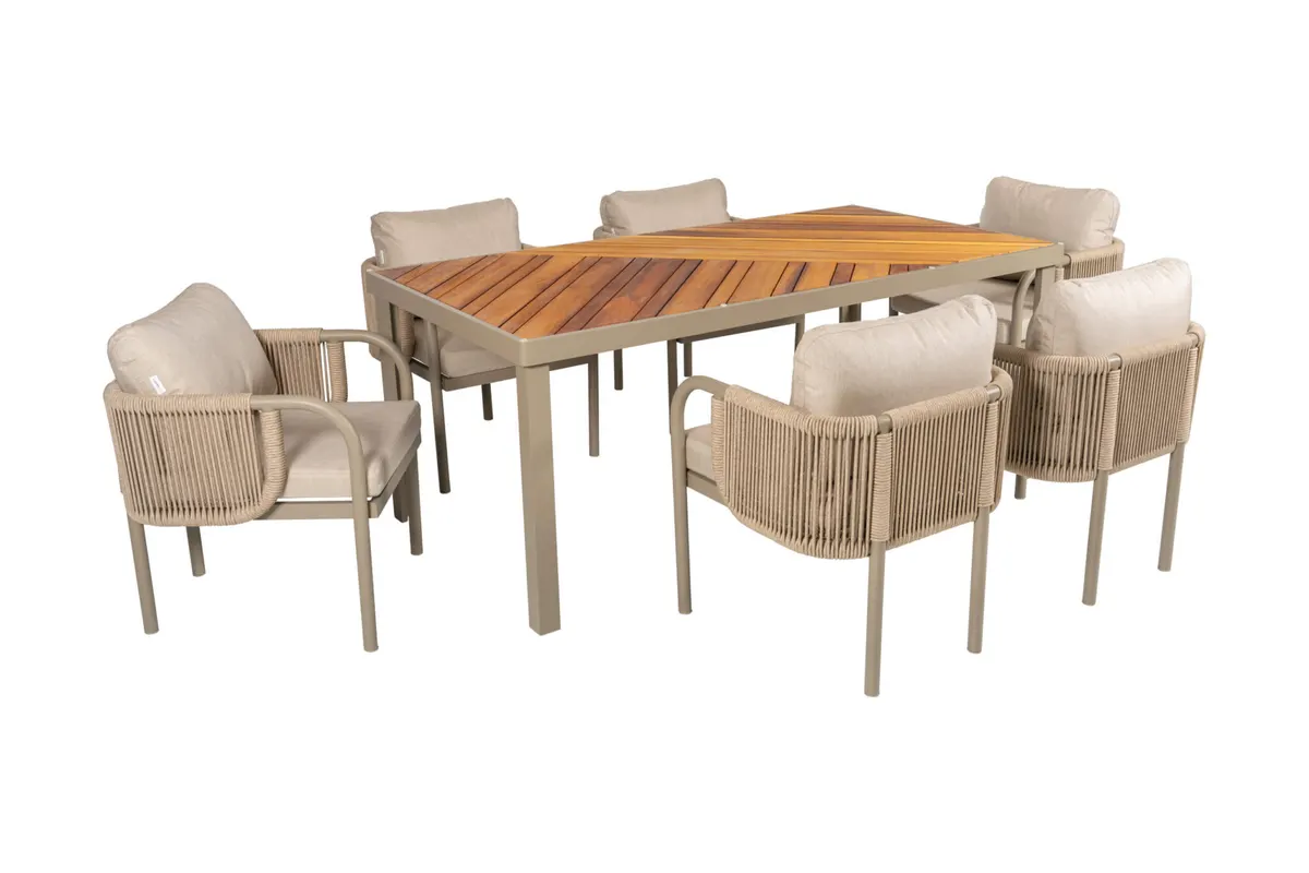 Uzun ömürlü alüminyum gövde, birinci sınıf İreko ağacı ve UV stabilizatörlü ip örgü ile hem şıklık hem dayanıklılık sunar.