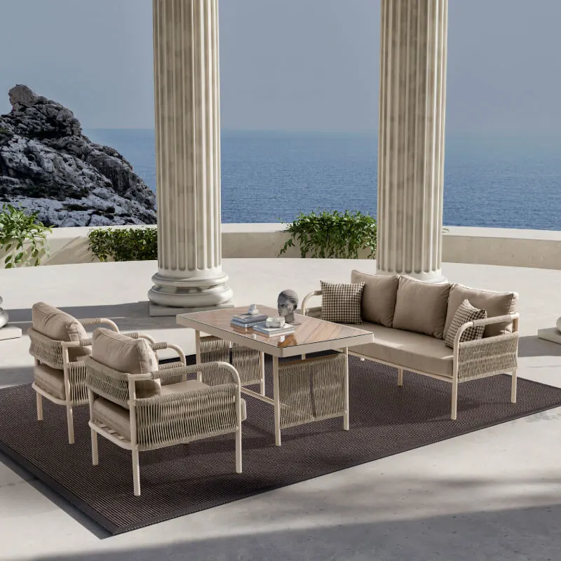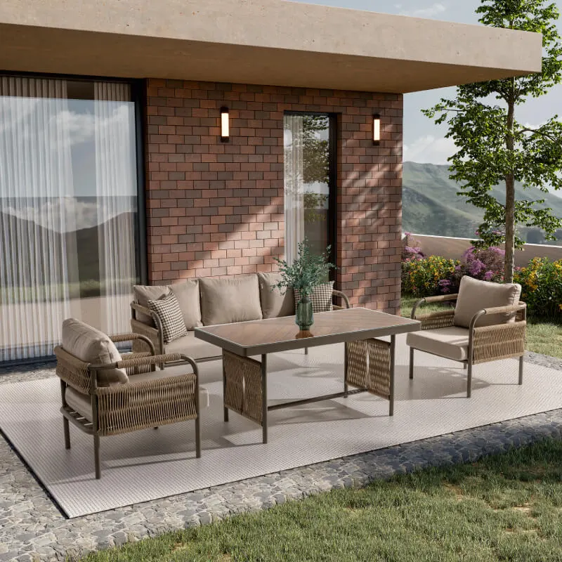 Uzun ömürlü alüminyum gövde, birinci sınıf İreko ağacı ve UV stabilizatörlü ip örgü ile hem şıklık hem dayanıklılık sunar.